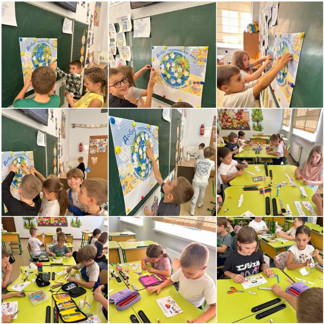 Учні працювали з плакатом «Добро переможе зло»: квіточками прикривали рани світу, в якому йде війна, а на пелюстках писали чесноти, які допомагають нести мир — доброту, терпіння, любов, сміливість, щедрість…