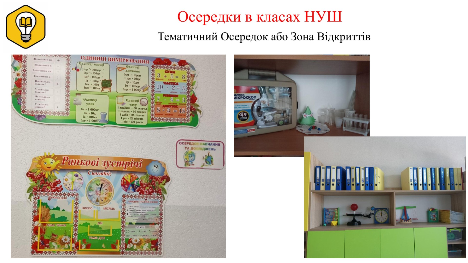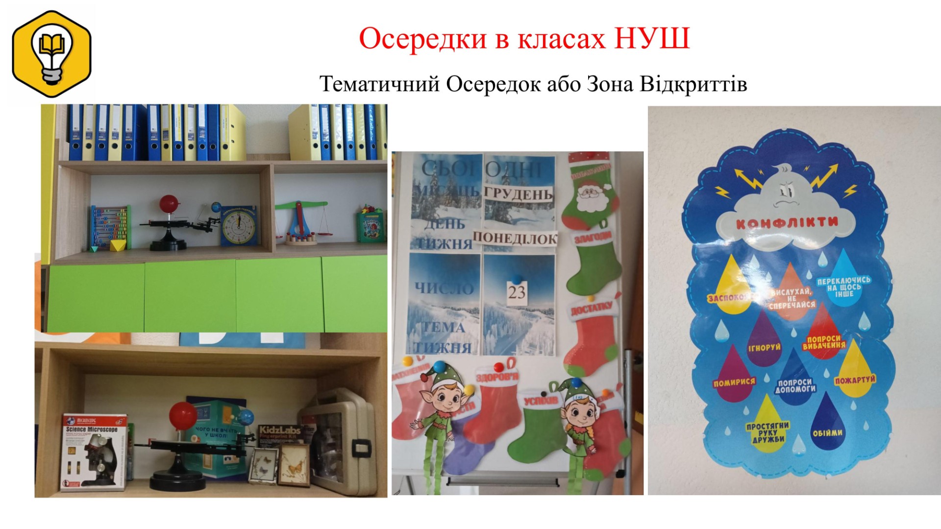 «Тематичний Осередок» учні обожнюють цей простір у класі — він найяскравіший і постійно видозмінюється залежно від теми уроку, пори року чи свят. Наочні матеріали в цьому осередку націлені на те, щоб підкреслити і виділити те головне, що вивчається. Кишені для змінної інформації, маркерна та магнітна дошки, стіна слів, щоденні учнівські рутини, правила класу та інше.