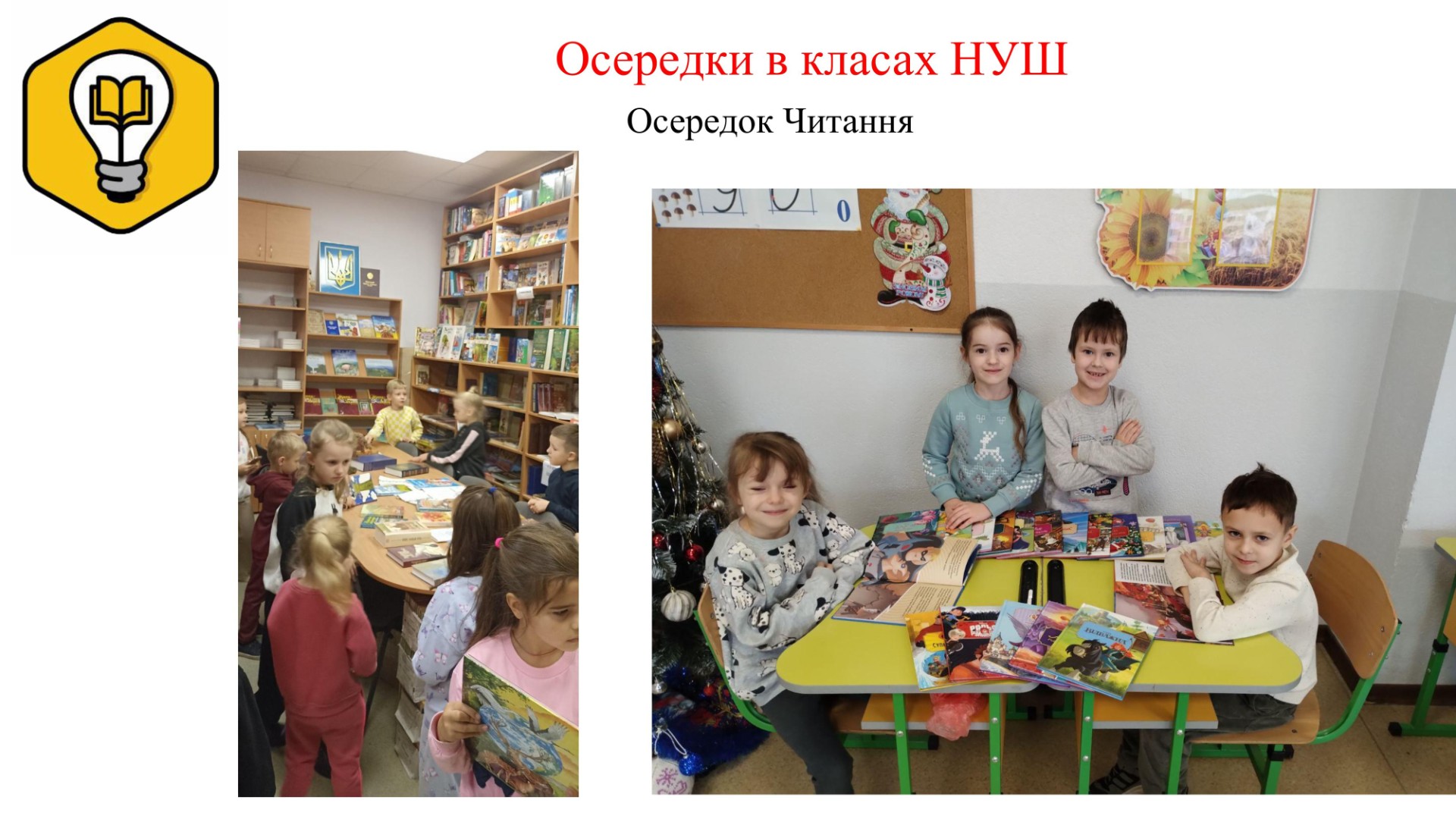 «Осередок Читання» у кожному класі обов’язково є міні-бібліотека з книжками, орієнтованими на вік дітей. Так кожна дитина щодня зможе самостійно обирати саме ту книгу, яка їй до вподоби. Важливо, щоб книгу можна було прочитати за 10–15 хвилин. Ну і звичайно діти також відвідують бібліотеку.