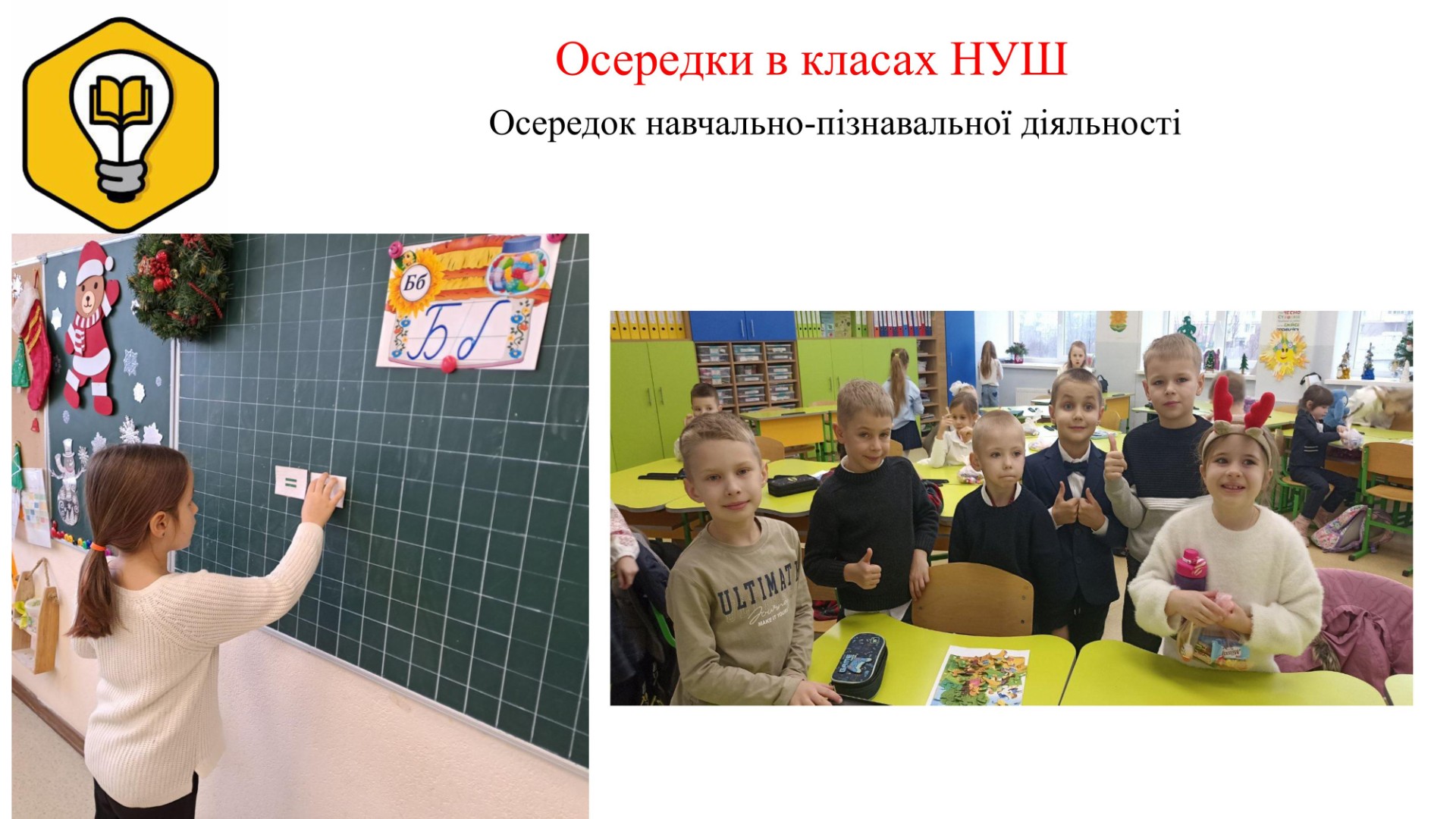 «Осередок навчально пізнавальної діяльності»- саме це місце, де відбувається основна освітня діяльність класу, як групова так і індивідуальна. Ця зона обладнується партами, дошкою для навчання телевізором або та інтерактивною дошкою. Осередок навчально пізнавальної діяльності