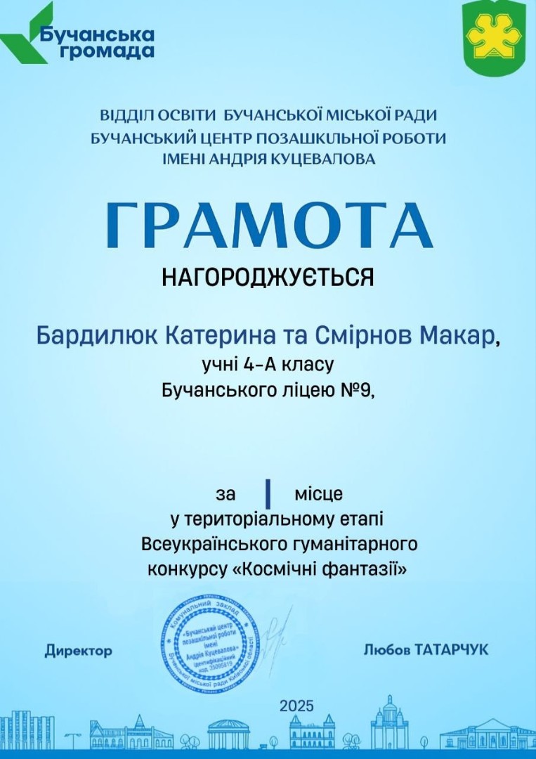 З почесним І місцем у територіальному етапі Всеукраїнського гуманітарного конкурсу «Космічні фантазії»! Пишаємося вашими успіхами та бажаємо нових звершень, яскравих ідей і подальших перемог! Нехай кожен ваш крок веде до нових відкриттів і досягнень!